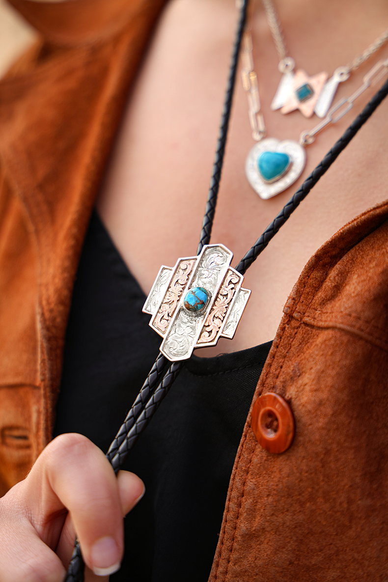 Create a bold look with the Aztec Bolo Tie. Offering a two-tone engraved angular design, this western motif is the perfect addition to your collared pearl-snap or as an accent piece worn loosely as a necklace. No matter how you style it, the Aztec Bolo Tie is a sophisticated western statement piece.