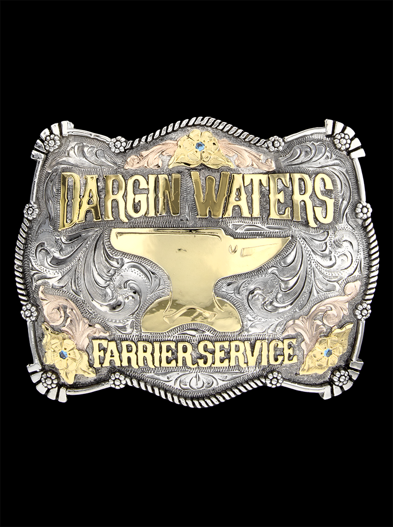 These remarkable plated filigree belt buckles are handmade and hand engraved from base materials and heavily plated with sterling silver and 10 and 14 karat gold, creating a beautiful and durable piece that will meet most budget requirements. The ornamental masterpieces illuminate with the full force of silver and gold at a perfectly affordable price. With over 100 unique buckle shapes, selections of background colors, stone colors, event figures, and custom die striking capabilities, the options for your custom belt buckles are infinite!