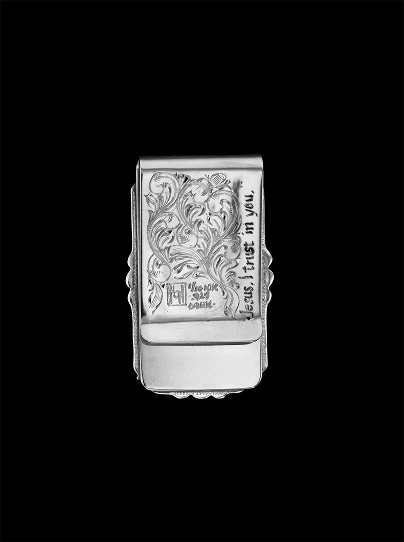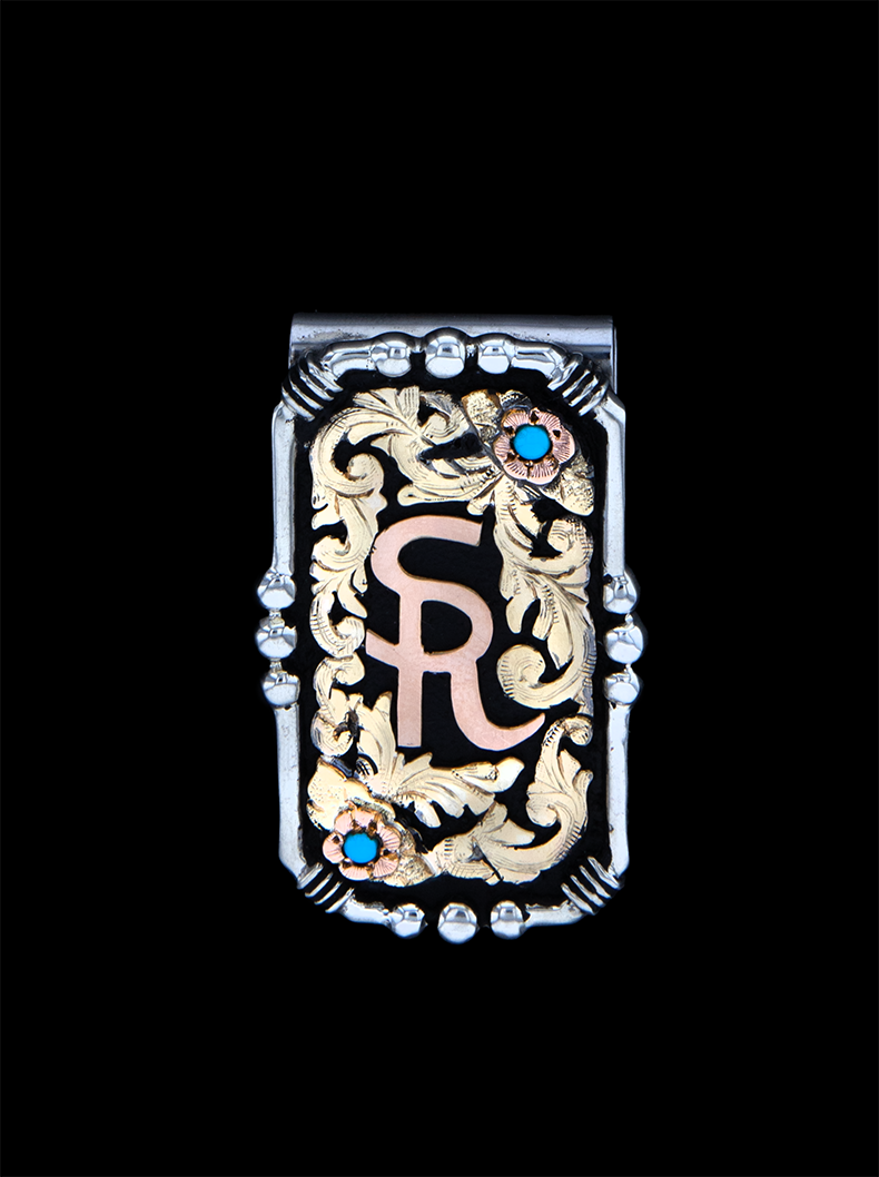 Personalize your folding money with the Custom Maverick Money Clip. The angled silver wrapped corners and beaded accents on this unique money clip make for a classic Western style boasting its artisan skill. Add a simple logo, brand or initials, and favorite stones for lasting style for generations to come.