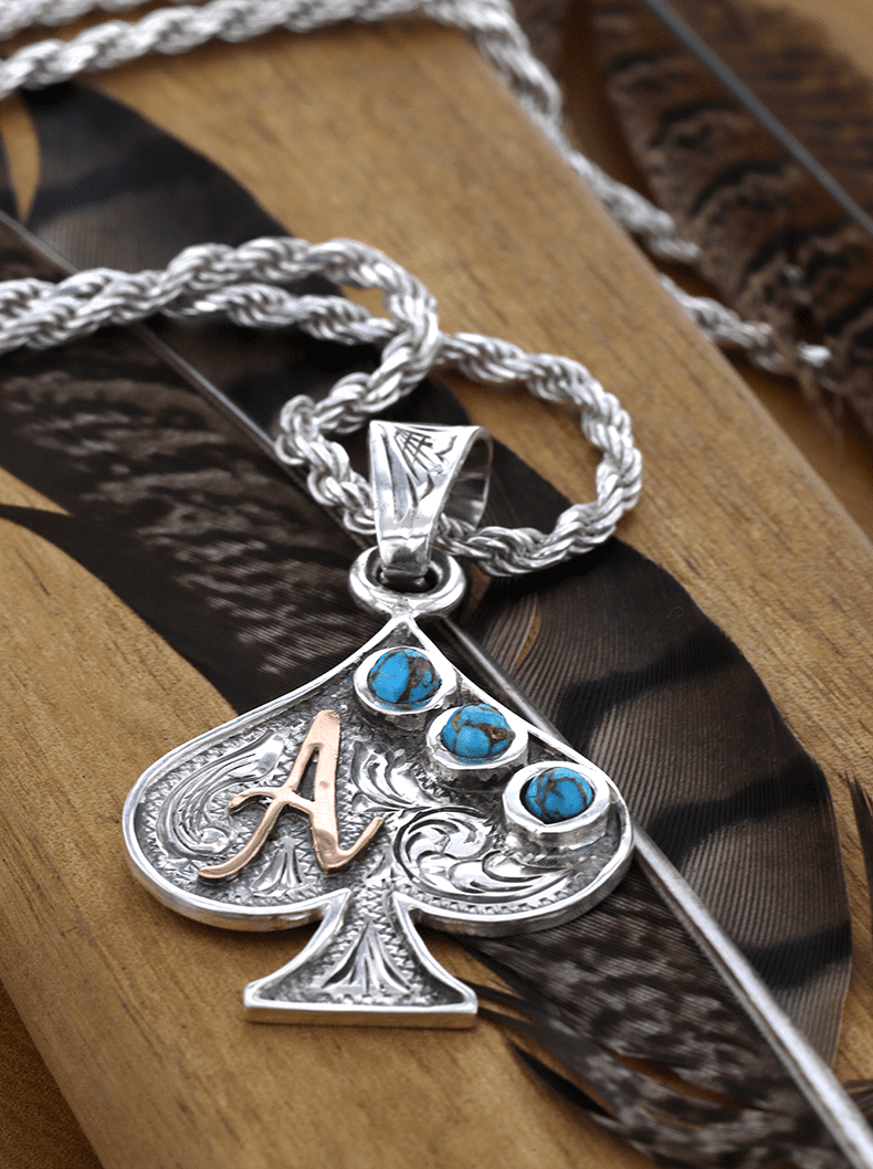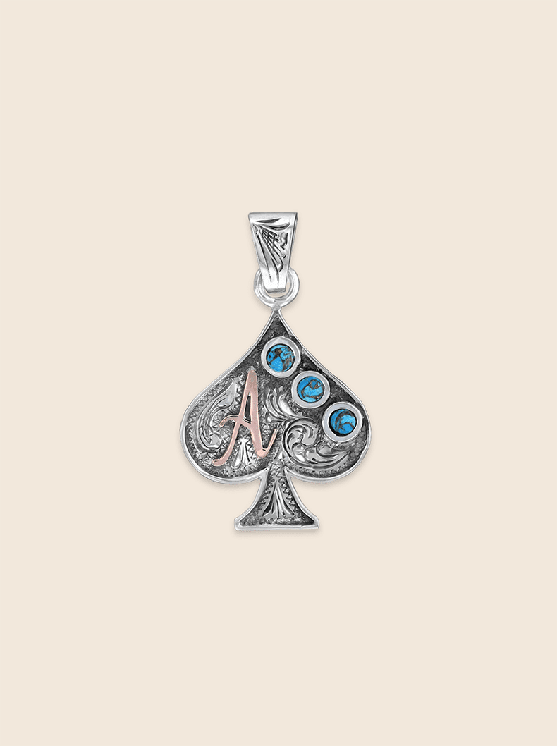 Play your winning hand with the Custom Ace of Spades Pendant. Crafted in sterling silver and signature engraved scrolls, this spade necklace charm’s bold design is the luck of the draw. Personalize it with your custom lettering or brand, then set it apart with your choice of stones for a one-of-a-kind playing card pendant. Whether you’re in the spotlight or riding the trail, this Ace of Spades necklace pendant shows off your legacy in true Hyo Silver style.