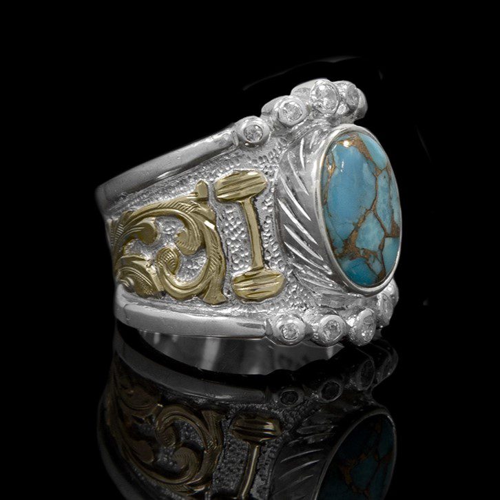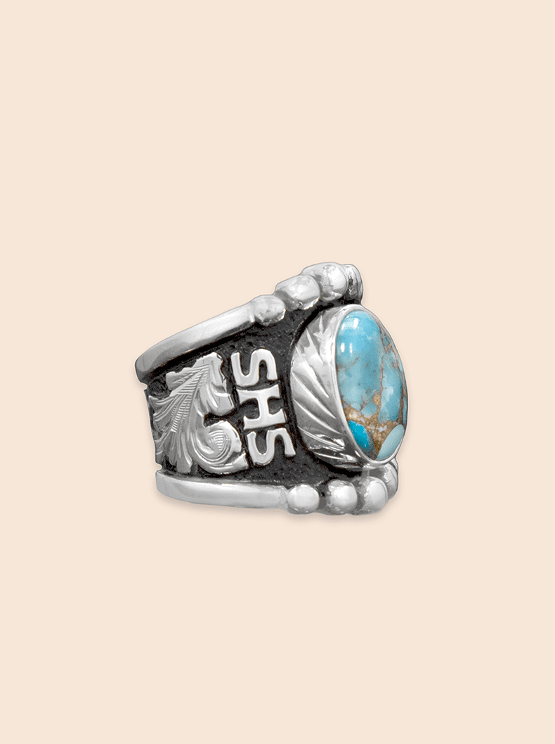 Enjoy a large featured RimRock stone with personalized lettering of initials or a brand with The Custom RimRock Statement Ring.  Choose from Black Onyx, Created Opal, Blue Turquoise, Blue Turquoise with Copper Matrix, Green Turquoise, or Purple Turquoise for your featured stone!