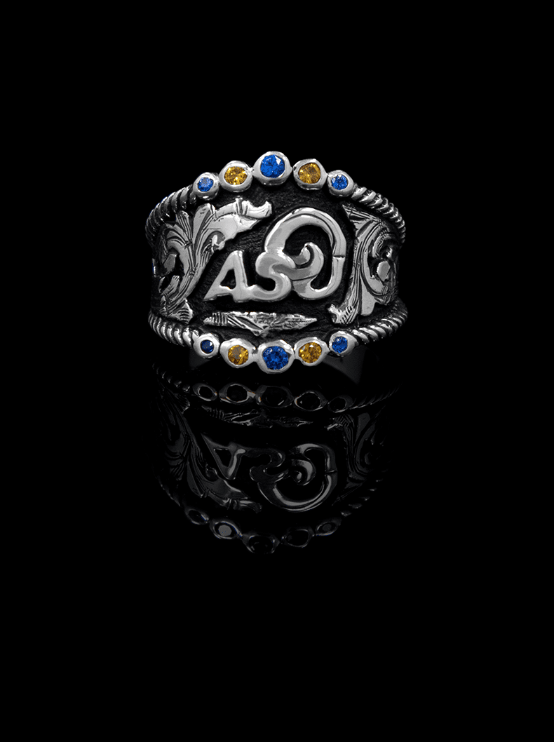 The Custom Rope Ring with Accent Stones is a beautiful sterling silver ring with twisted silver rope and showcases your choice of lettering and accent stones.