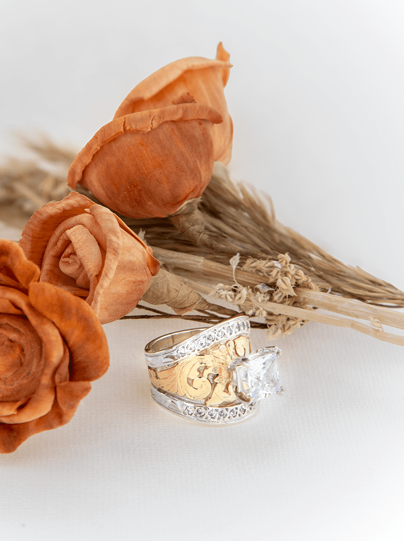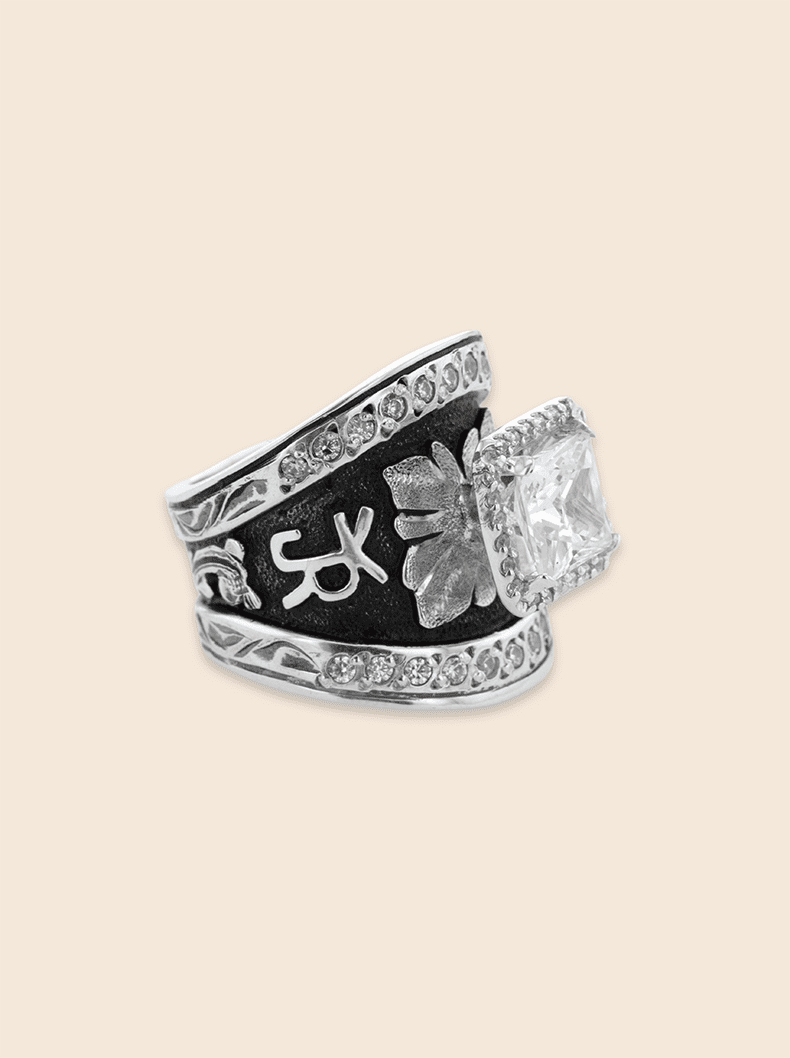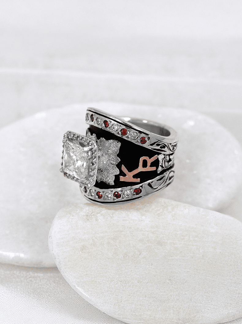 You’ll love the grand look of the Personalized Crystal & Solitaire Statement Ring. Â Customize this beauty with colorful accent crystals or center stone! Add your initials or brand for an individualized style.