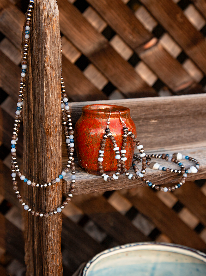 Perfect for a coastal cowgirl, the Denim & Dirt Set pairs the serene blue opal stones and engraved scrolls capture western tradition and nature inspired opalescence. Each Beaded Necklace and Bracelet is a blend of Genuine Blue Opal & Brown Snowflake Obsidian Beads with Navajo Pearl Accents. Complementing a pair of jeans and leather boots or a coastal get-up, this will be her new go to jewelry items.