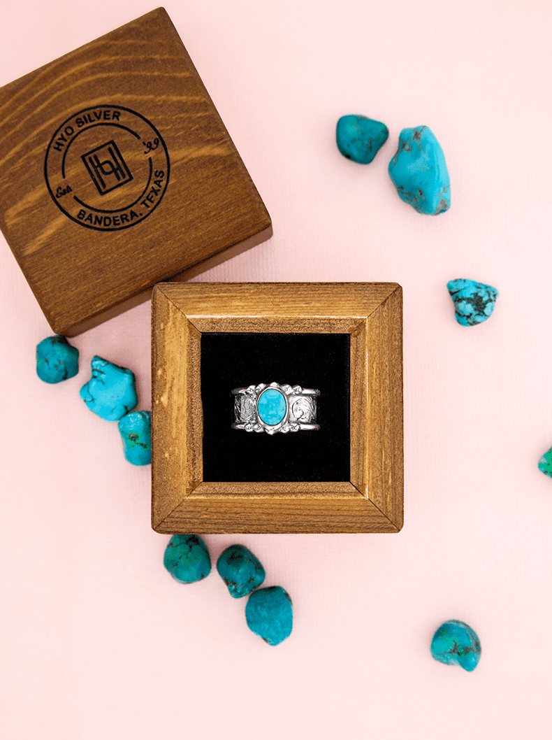 Enjoy the gorgeous vibrancy of blue turquoise and silver in the Western Silver Turquoise Ring. Accentuated with a bezel setting and artisan scrollwork making this an outstanding statement-making ring!